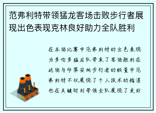 在本场比赛中,范弗利特的出色表现为多伦多猛龙队带来了客场胜利。在这场与印第安纳步行者的较量中,范弗利特不仅展现了个人技术的精湛,也在关键时刻带领全队展现了良好的团队协作。全场比赛,范弗利特的全面表现无...
