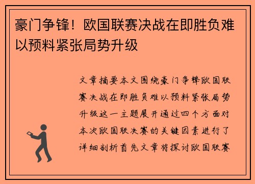 文章摘要:本文围绕“豪门争锋!欧国联赛决战在即,胜负难以预料,紧张局势升级”这一主题展开,通过四个方面对本次欧国联决赛的关键因素进行了详细剖析。首先,文章将探讨欧国联赛的历史背景与竞争格局,分析各大豪...