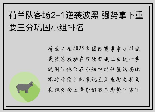 荷兰队在2025年国际赛事中以2-1逆袭波黑,成功在客场带走三分,进一步巩固了他们在小组中的位置。这场比赛对于荷兰队来说至关重要,尤其是在积分榜上争夺的激烈态势下,拿下这一胜利无疑为他们的出线之路提供...