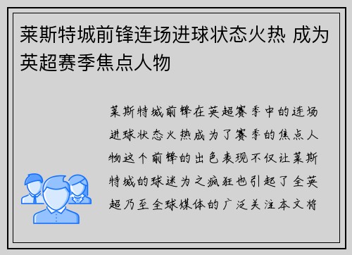 莱斯特城前锋在英超赛季中的连场进球状态火热,成为了赛季的焦点人物。这个前锋的出色表现不仅让莱斯特城的球迷为之疯狂,也引起了全英超乃至全球媒体的广泛关注。本文将从四个方面详细阐述莱斯特城前锋的进球状态为...