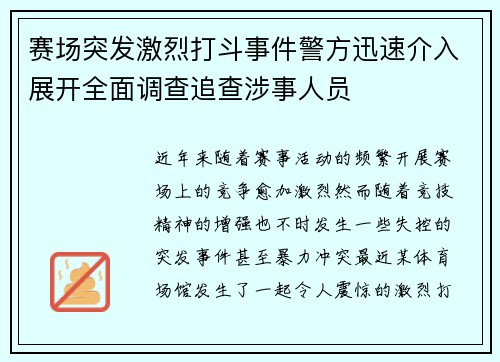 近年来,随着赛事活动的频繁开展,赛场上的竞争愈加激烈。然而,随着竞技精神的增强,也不时发生一些失控的突发事件,甚至暴力冲突。最近,某体育场馆发生了一起令人震惊的激烈打斗事件,赛事原本激烈的氛围瞬间变得...