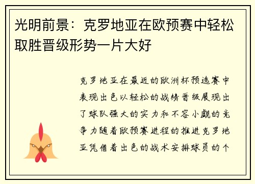 克罗地亚在最近的欧洲杯预选赛中表现出色,以轻松的战绩晋级,展现出了球队强大的实力和不容小觑的竞争力。随着欧预赛进程的推进,克罗地亚凭借着出色的战术安排、球员的个人能力、教练的卓越领导以及球队的整体默契...