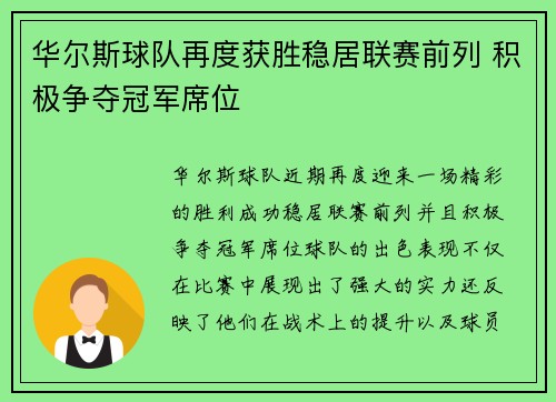 华尔斯球队近期再度迎来一场精彩的胜利,成功稳居联赛前列,并且积极争夺冠军席位。球队的出色表现不仅在比赛中展现出了强大的实力,还反映了他们在战术上的提升以及球员个人的进步。本文将从四个方面来详细分析华尔...