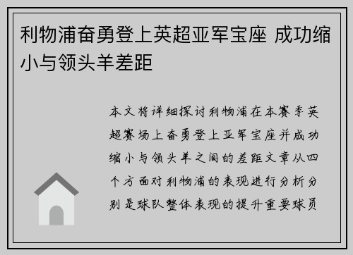 本文将详细探讨利物浦在本赛季英超赛场上奋勇登上亚军宝座,并成功缩小与领头羊之间的差距。文章从四个方面对利物浦的表现进行分析,分别是:球队整体表现的提升,重要球员的出色发挥,战术体系的灵活调整,以及队伍...