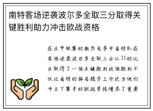 在法甲联赛的激烈竞争中,南特队在客场逆袭波尔多,全取三分,以3-1的比分取得了一场关键胜利。这场胜利不仅让南特的排名稳步上升,还为他们冲击下赛季的欧战资格增添了重要的砝码。通过战术上的精准执行、球员们...