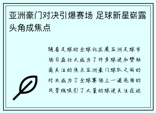 随着足球的全球化发展,亚洲足球市场日益壮大,成为了许多球迷和赞助商关注的焦点。亚洲豪门球队之间的对决,成为了全球赛场上一道亮丽的风景线,吸引了大量的球迷关注。在这一过程中,许多足球新星迅速崭露头角,成...