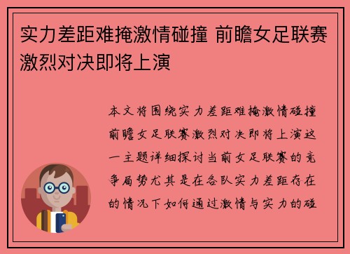 本文将围绕“实力差距难掩激情碰撞,前瞻女足联赛激烈对决即将上演”这一主题,详细探讨当前女足联赛的竞争局势,尤其是在各队实力差距存在的情况下,如何通过激情与实力的碰撞展现出比赛的精彩与魅力。文章将从四个...