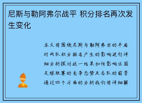 本文将围绕尼斯与勒阿弗尔的平局对两队积分排名产生的影响进行详细分析,探讨这一结果如何影响法国足球联赛的竞争态势及各队的前景。通过四个方面的分析,我们将详细解读这一平局背后所蕴含的战术变化、两队的表现对...