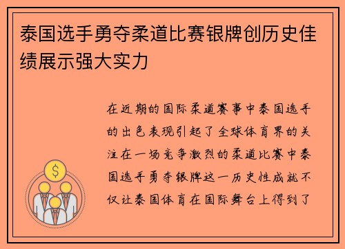 在近期的国际柔道赛事中,泰国选手的出色表现引起了全球体育界的关注。在一场竞争激烈的柔道比赛中,泰国选手勇夺银牌,这一历史性成就不仅让泰国体育在国际舞台上得到了广泛认可,也展示了泰国柔道选手强大的实力与...