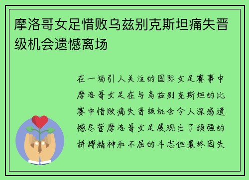 在一场引人关注的国际女足赛事中,摩洛哥女足在与乌兹别克斯坦的比赛中惜败,痛失晋级机会,令人深感遗憾。尽管摩洛哥女足展现出了顽强的拼搏精神和不屈的斗志,但最终因失误、体力问题以及缺乏应对关键时刻的能力,...