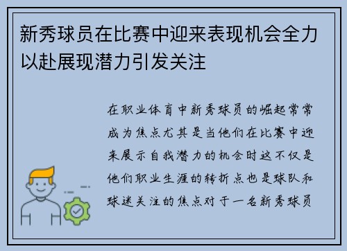在职业体育中,新秀球员的崛起常常成为焦点,尤其是当他们在比赛中迎来展示自我潜力的机会时。这不仅是他们职业生涯的转折点,也是球队和球迷关注的焦点。对于一名新秀球员来说,如何在有限的上场时间里全力以赴,抓...