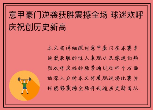 本文将详细探讨意甲豪门在本赛季逆袭获胜的惊人表现,以及球迷们热烈欢呼庆祝的场景。通过对四个方面的深入分析,本文将展现这场比赛为何能够震撼全场并创造历史新高。从意甲豪门的备战过程、关键球员的卓越表现、战...