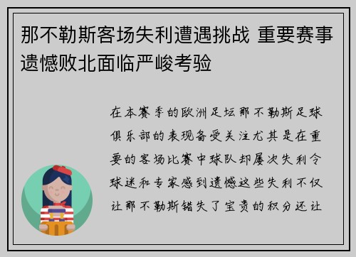 在本赛季的欧洲足坛,那不勒斯足球俱乐部的表现备受关注。尤其是在重要的客场比赛中,球队却屡次失利,令球迷和专家感到遗憾。这些失利不仅让那不勒斯错失了宝贵的积分,还让球队在欧战和联赛的道路上遭遇了严峻考验...