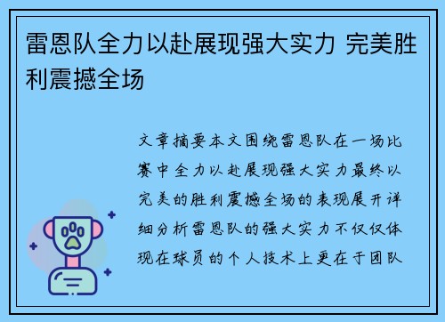 文章摘要:本文围绕雷恩队在一场比赛中全力以赴展现强大实力,最终以完美的胜利震撼全场的表现展开详细分析。雷恩队的强大实力不仅仅体现在球员的个人技术上,更在于团队协作、战术执行、心理素质以及教练的指导等多...