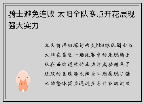 本文将详细探讨两支NBA球队——骑士与太阳在最近一场比赛中的表现。骑士队在面对连败的压力时,成功避免了连败的困境,而太阳全队则展现了强大的整体实力,通过多点开花的进攻方式打出了一场令人印象深刻的比赛。...